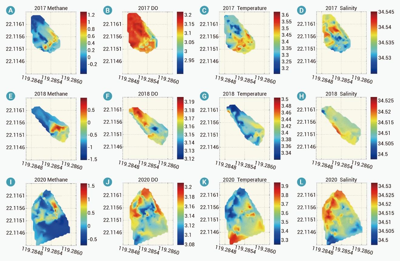 图3 南海冷泉近海底水体原位环境参数时空分布特征