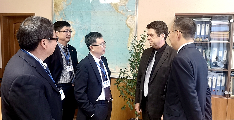 国际合作局副局长王振宇、海洋所副所长李超伦率代表团一行7人访问俄罗斯科学院远东分院时,受到分院副院长多尔吉赫院士的热情接待。多尔吉赫副院长对中科院代表团到访表示欢迎,并介绍了远东分院的人员架构、主要研究方向、国际合作情况等情况。王振宇副局长对远东分院取得的成就表示钦佩,并介绍了中科院的基本概况及国际合作情况。他表示,远东分院始终大力支持双方研究所在海洋领域的合作,希望在未来合作中能够继续得到远东分院的支持。多尔吉赫表示,俄罗斯已从中国“一带一路”倡议中获益,两国的科技合作不断取得新进展,希望双方能够在此框架下继续开展互利共赢合作。李超伦副所长介绍了海洋所的基本情况及与俄罗斯相关院所的合作情况,海洋所和远东分院国家海洋生物科学中心已开展12年的合作,两所的双边会议也成为重要的合作平台之一,建议在未来合作中,以与生物中心的合作为基础,继续拓展与其他研究所的实质性合作。