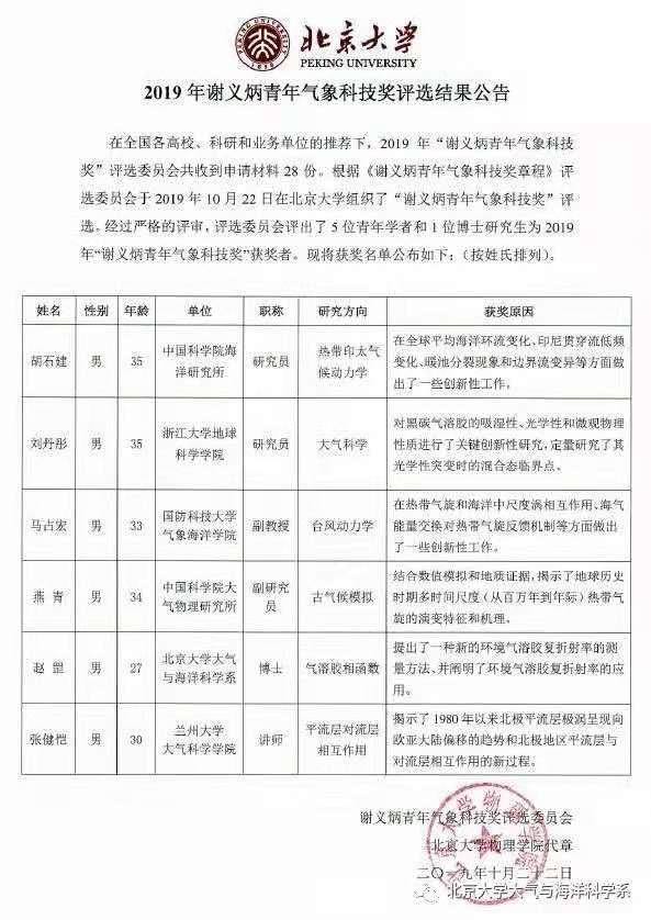 由北京大学组织的2019年谢义炳青年气象科技奖日前正式揭晓。中国科学院海洋研究所胡石建研究员荣获该奖项,以表彰其在热带印太气候动力学方面取得的突出成绩。本年度谢义炳青年气象科技奖评选委员会共收到由全国各高校、科研院所和业务单位推荐的28份申请。评选委员会根据《谢义炳青年气象科技奖章程》进行了严格的评审,评选出5位青年学者和1位博士研究生为2019年度谢义炳青年气象科技奖获奖者。这是海洋所研究人员首次获得该奖项。
