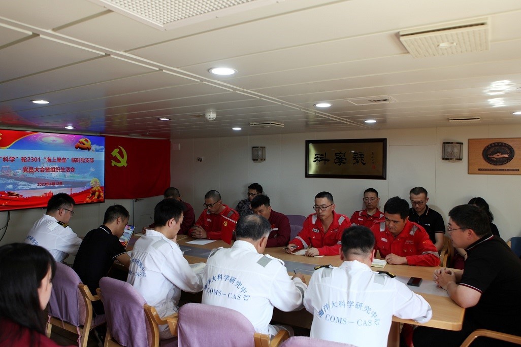 4月12日,“科学”轮2301航次“海上堡垒”临时党支部组织召开航次总结暨组织生活会,临时党支部书记、航次首席科学家汪嘉宁同志主持会议,支部全体党员、入党积极分子参加会议,船长、九三学社社员刘合义列席会议。