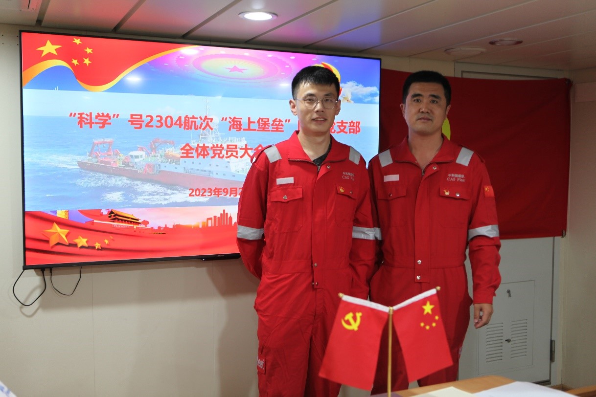 会上,姜金光宣读了《中共中国科学院海洋研究所委员会关于成立“科学”轮2304航次“海上堡垒”临时党支部的通知》,本航次共26名共产党员,分属中国科学院海洋研究所、中国科学院广州地球化学研究所、华洋海事等单位。工程技术部副主任姜金光任临时党支部书记,康中平任组织委员兼纪检委员,船长梁喜祥任宣传委员兼统战委员。