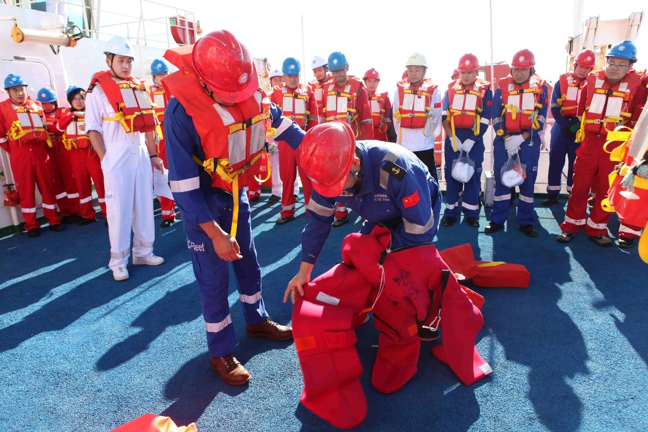 为进一步提升船舶安全管理水平,增强“科学”轮应急响应能力,提高应急装备可靠性,提升船、队员应急反应能力,“海上堡垒”临时党支部组织开展了船舶安全培训和救生消防应急演练专项活动。近一个小时的演习过程中,全体船、队员任务明确、操作规范、动作到位、响应迅速,达到了演练预期效果。为使本航次科考队员尽快熟悉船上生活和工作环境,了解船上应急反应程序,保护自身健康、工作安全和海上环境,“海上堡垒”临时党支部组织船上各部门结合各自工作重点及本航次调查任务,开展了针对性培训,带领随船科考队员共同学习了《“科学”轮科学家手册》,并参观了驾驶台、集控室、地球物理室等场所。
