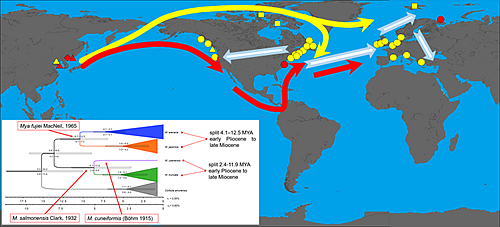 砂海螂在我国俗称为大蚍、蚍蛤、蚬母,是一种重要的经济双壳贝类,在欧洲、北美也被大规模养殖。由于该类群形态变异较大,且多地有化石存在,欧美学者普遍认为这个广布类群为单一种Mya arenaria。然而,从19世纪50年代起有亚洲学者提出质疑,西太平洋的种群应为另一种Mya japonica,争论一直持续,而未得到很好解决,而且对于其分布的范围、在太平洋的扩散时间和路径也并不清楚。