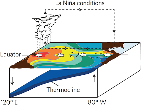 厄尔尼诺(左)和拉尼娜(右)事件示意图(McPhaden, 2015)