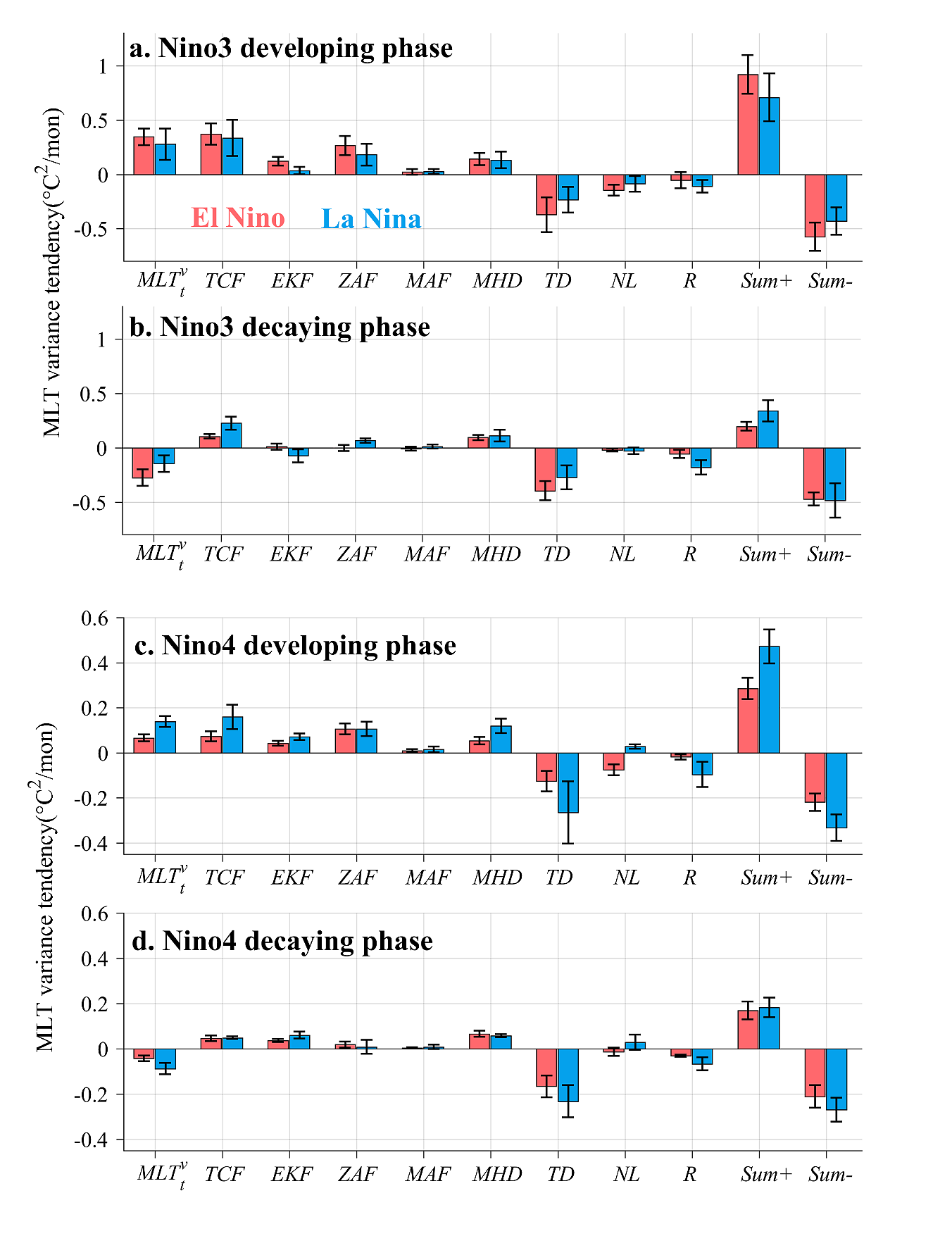 课题组进一步深入研究了各海洋动力学反馈过程在ENSO非对称性形成中的定量作用。研究人员基于温度方差收支方程,深入分析了赤道中东太平洋温度异常幅度的非对称性和ENSO冷暖位相的持续时间的非对称性。研究发现,厄尔尼诺期间东太平洋具有更强的正反馈过程,导致厄尔尼诺具有比拉尼娜更大的温度异常振幅;而在中太平洋,拉尼娜事件由于在发展期具有较强的温跃层正反馈和较弱的非线性阻尼效应,因而具有更快的温度异常增长率。同时发现,在厄尔尼诺衰退期温跃层反馈由正反馈转变为负反馈过程,使得厄尔尼诺较拉尼娜更快消亡,从而导致ENSO冷暖位相持续时间的非对称性,而温跃层反馈过程在ENSO事件衰退期的不同体现了充放电机制的非对称性。研究成果将显著提高对ENSO动力学机制的认识,为进一步提高ENSO预测水平提供有力的理论依据。
