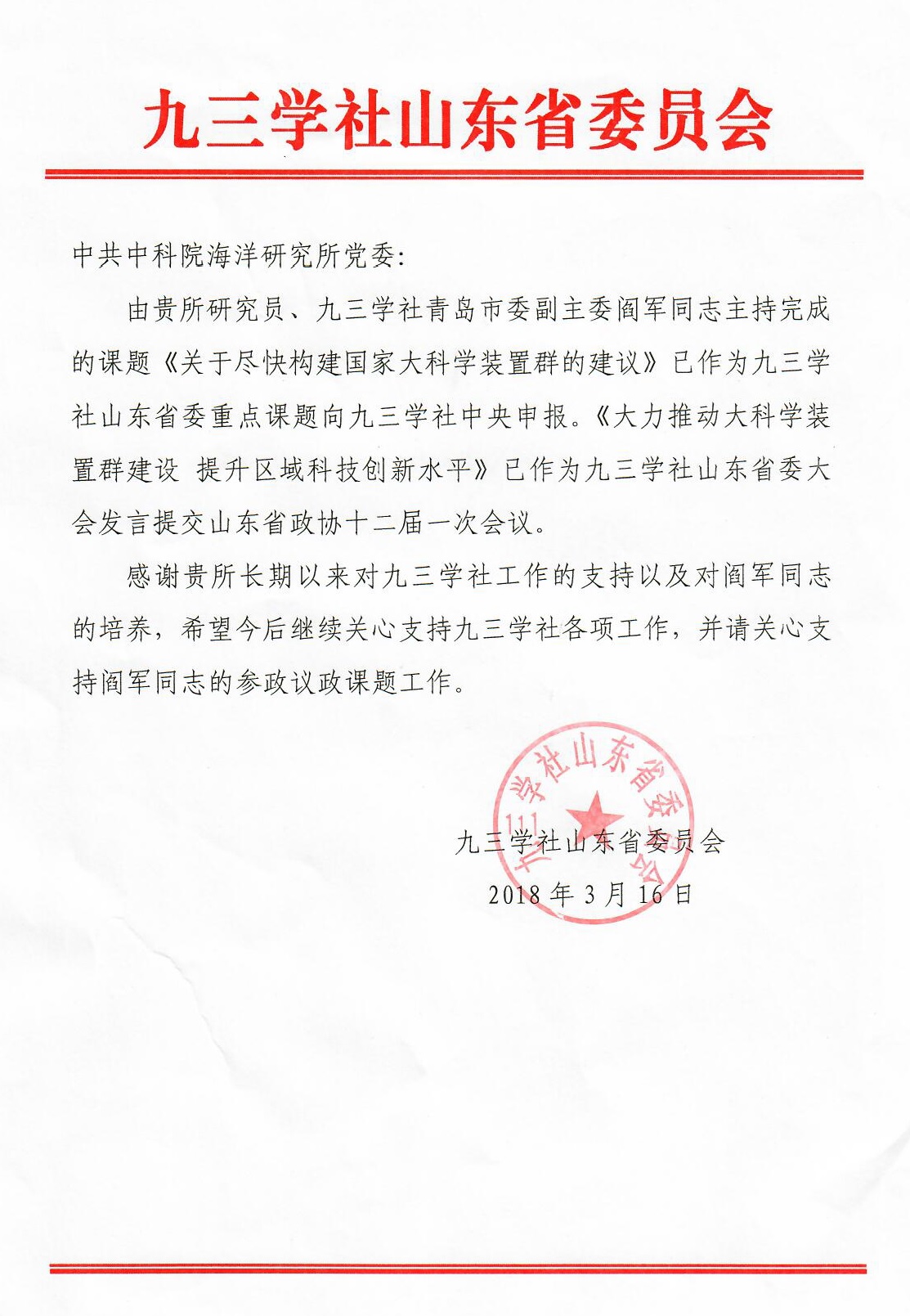 感谢信中写道:阎军同志主持完成的课题《关于尽快构建国家大科学装置群的建议》已作为九三学社山东省委重点课题向九三学社中央申报,《大力推动大科学装置群建设 提升区域科技创新水平》已作为九三学社山东省委大会发言提交山东省政协十二届一次会议。感谢海洋所长期以来对九三学社工作的支持以及对阎军同志的培养,希望今后继续关心支持九三学社各项工作,并请继续支持阎军同志的参政议政课题工作。