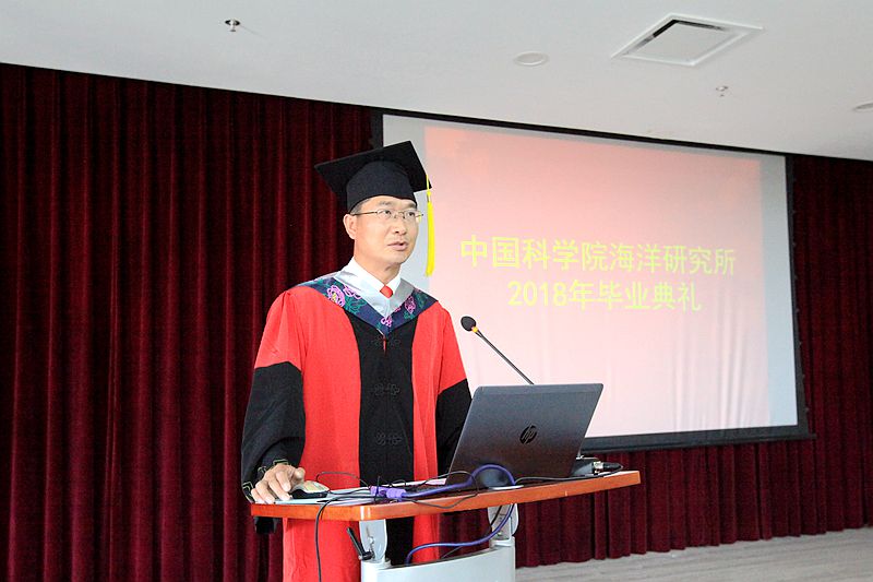 典礼在雄壮的国歌声中拉开序幕。李超伦副所长宣读了2018年通过毕业答辩的108名学生名单,其中硕士研究生40人、博士研究生68人,涵盖了物理海洋学、海洋化学、海洋生物学、海洋生态学、海洋地质学、水产养殖、环境工程、海洋药物学等专业学科。杨红生常务副所长宣读了获得国家、山东省、中科院及海洋所等各类奖项的优秀毕业生名单。