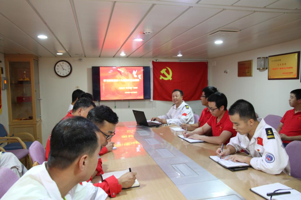 临时党支部书记杜玉刚同志简要总结了“科学”号1903航次科考作业情况及开展的支部活动。他表示,航次科考任务的顺利完成离不开全体党员在航次中的先锋模范带头作用,临近航次结束召开主题党日,希望给大家搭建一个总结、学习、交流的平台。