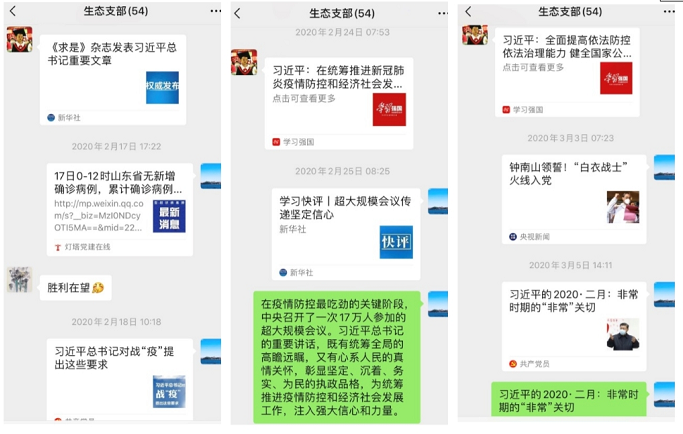 疫情发生以来,生态党支部发挥基层党组织战斗堡垒作用,关心党员群众安全防护情况,鼓励党员在疫情防控中发挥积极作用。支部通过微信群、电话等多种“无接触”方式,将党中央在疫情期间发布的最新政策和文件及时传递给广大党员,并组织党员自愿捐款3994元,为防疫工作尽一份力量。
