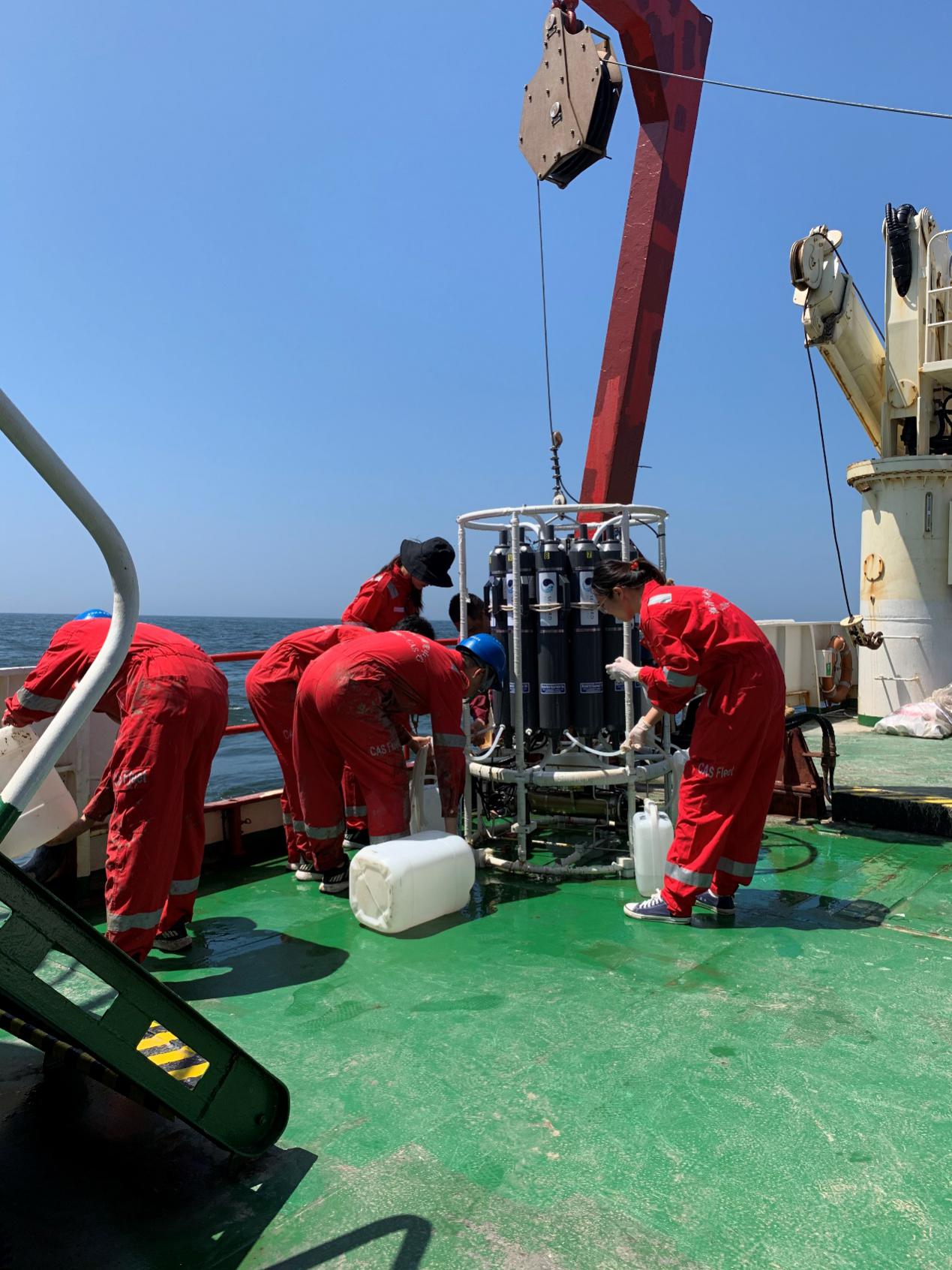 航次首席科学家王启栋介绍,本航次针对长江口及其邻近海域的两个低氧核心区,分别设置了十字断面和T型断面展开科学调查,总计完成CTD大面站综合观测取样51次,完成全水层大体积采水2次、箱式采泥54次、柱状样12次,并开展了其他采样作业,获取了大量样品和实时监测数据。现场调查监测数据初步显示,长江口及其邻近海域已出现大面积底层低氧,和往年相比低氧面积有进一步扩大的趋势,需要继续加强关注。