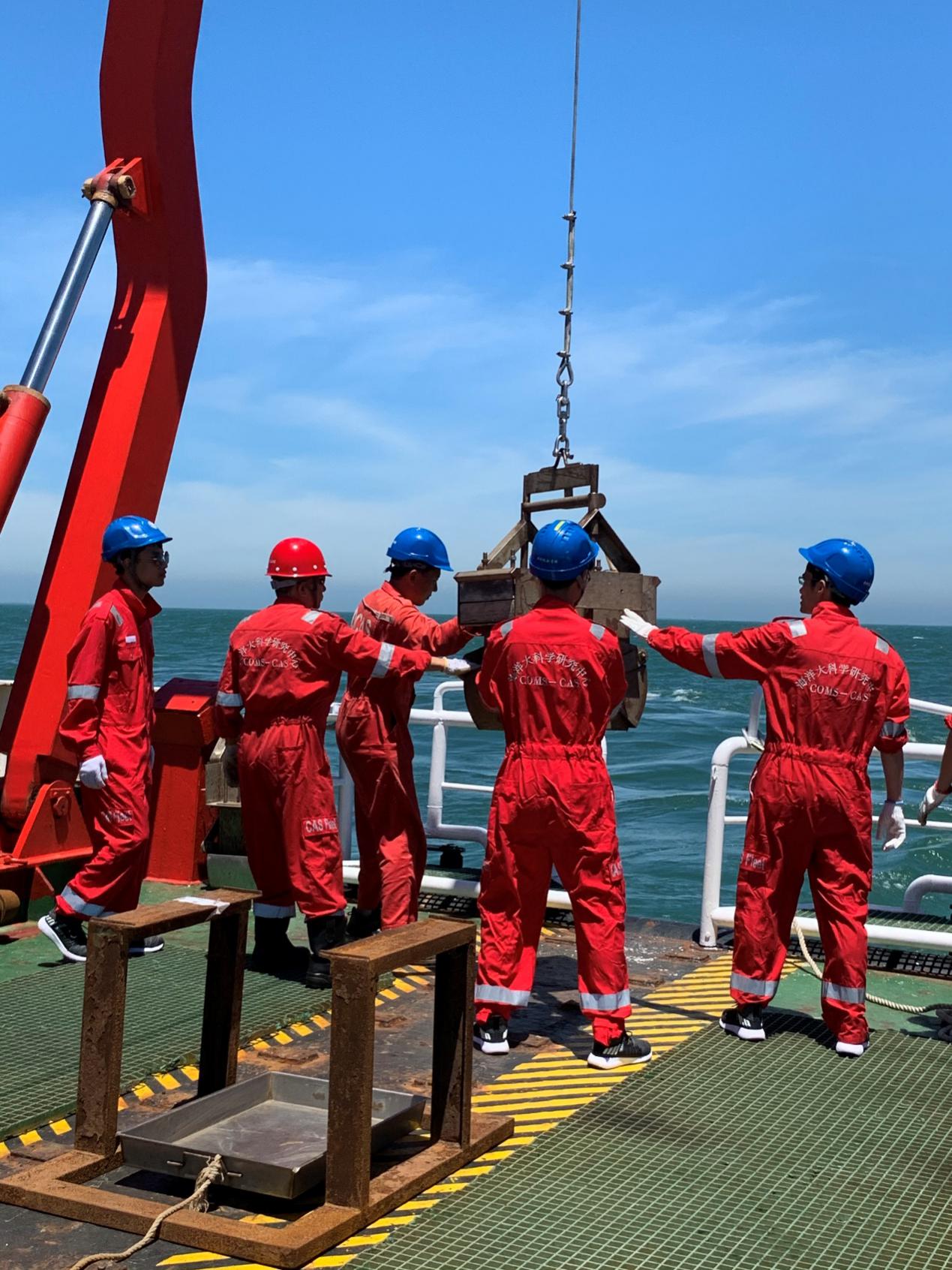 科考队员后甲板采泥作业