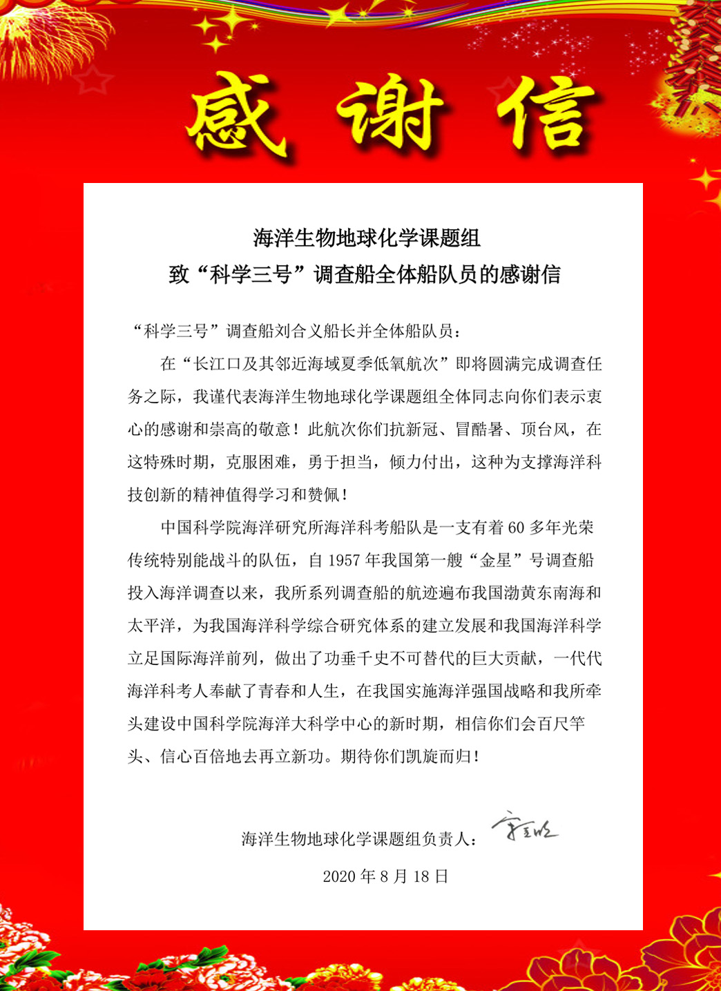 海洋生物地球化学课题组负责人宋金明研究员向“科学三号”发来感谢信