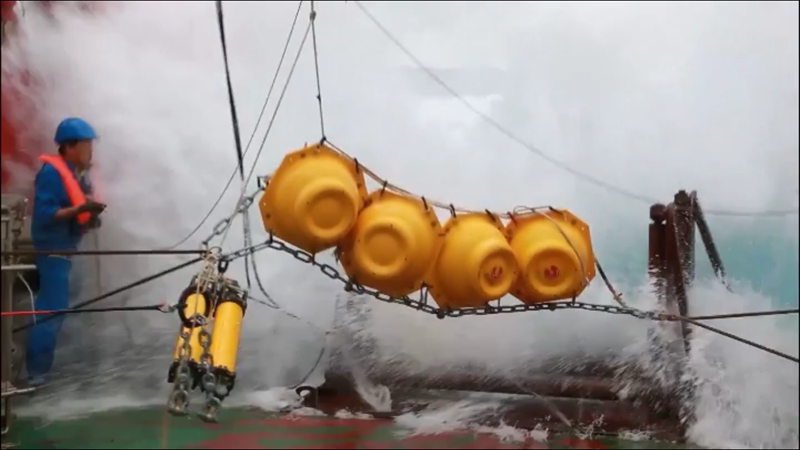 在回收浮球过程中,由于海况恶劣,后甲板突然上浪,浪高接近5米