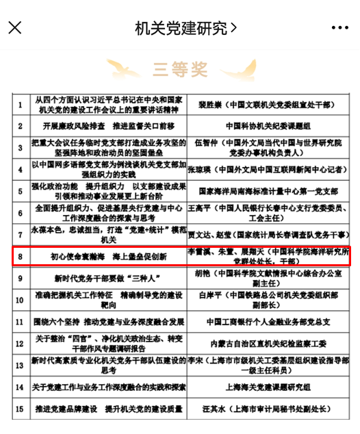 为推动学习贯彻习近平总书记在中央和国家机关党的建设工作会议上的重要讲话精神往深里走、往实里走,机关党建研究杂志社联合全国党建研究会机关专委会、中国知网开展了学习贯彻重要讲话精神优秀成果征集活动。征集活动获奖名单近日公布,海洋所提交的《初心使命寰瀚海 海上堡垒促创新》(作者:李雷溪、朱萱、展翔天)获得三等奖,系山东省科研院所、高校系统唯一获奖单位。