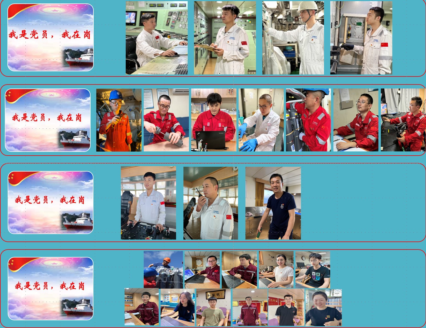 2201航次“海上堡垒”临时党支部为认真贯彻院党组关于“聚焦主责主业狠抓工作落实”的年度工作要求,结合航次任务开展“我是党员我在岗”党建主题活动。“海上堡垒”临时党支部由甲板部、轮机部、实验室和科考队四个团队党员组成,在每个工作岗位上设置党员信息栏,公示党员照片,让党员们在岗位中亮身份、树形象、做示范,以实际行动践行共产党员的使命和担当。