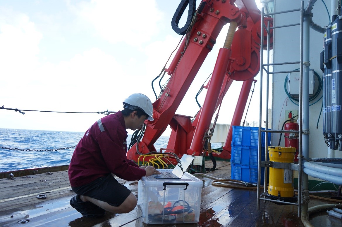 航次队长马杰在甲板处理数据