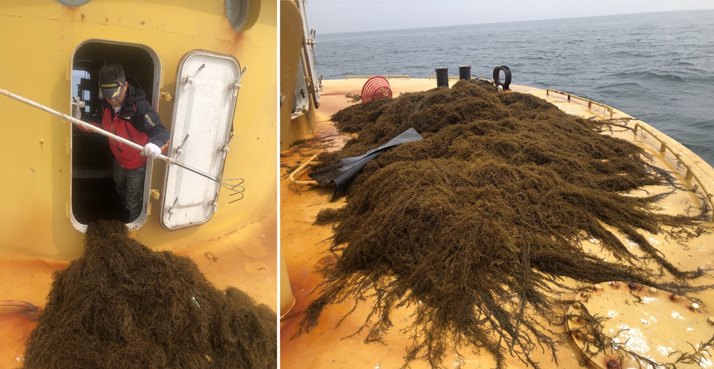 工作人员清理三锚平台中心观测井堆积的马尾藻