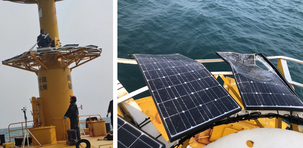 对东海站21号浮标被过往大型船只碰撞太阳能板损坏,工作人员进行紧急抢修