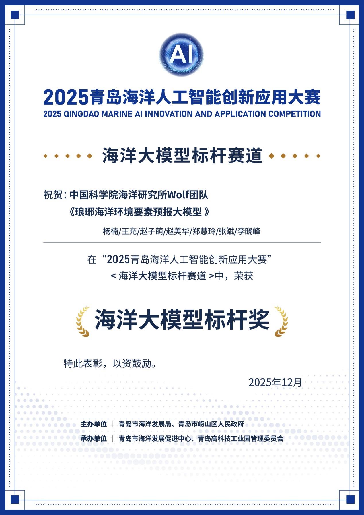 近日,中国科学院海洋研究所人工智能海洋学研究组研发的“琅琊海洋环境要素预报大模型”在“2025青岛海洋人工智能创新应用大赛”海洋大模型标杆赛道中荣获“海洋大模型标杆奖”。