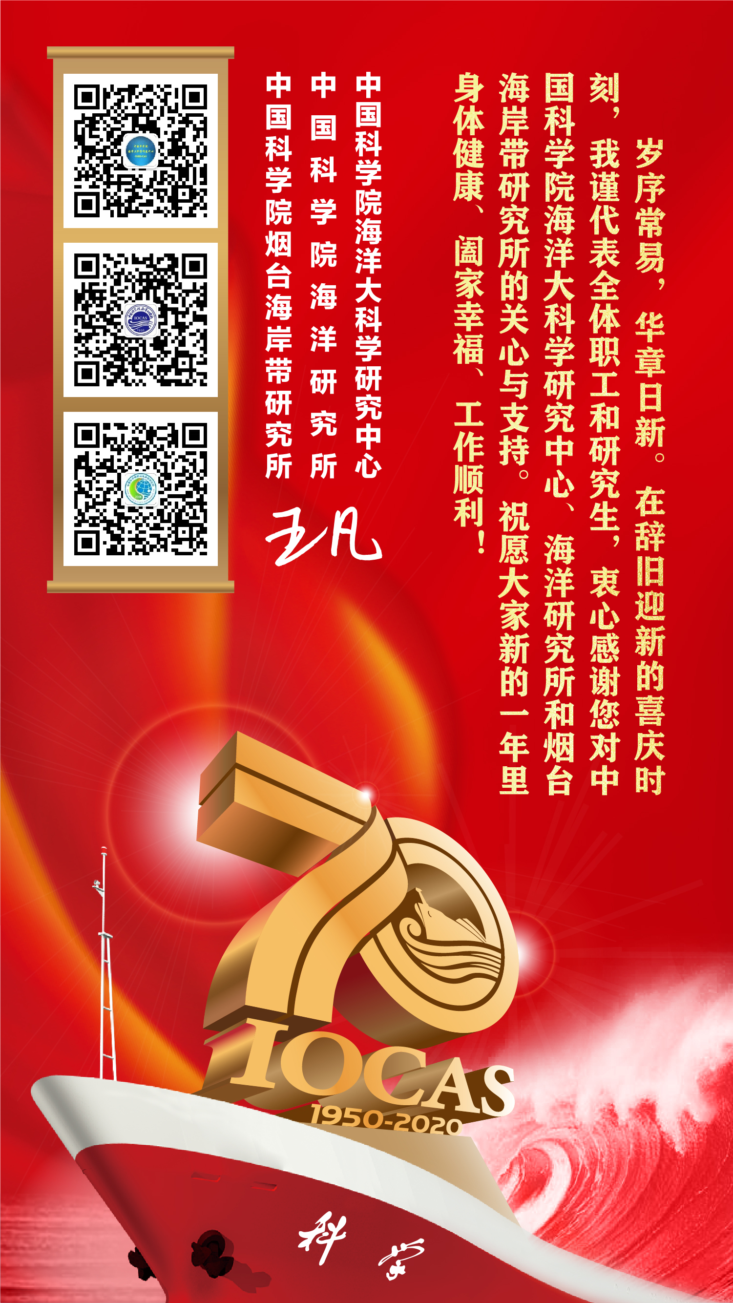 岁序常易,华章日新。2020年新年钟声即将敲响之际,我谨代表中国科学院海洋大科学研究中心、海洋研究所和烟台海岸带研究所,向全体职工、离退休同志和研究生们,以及长期以来关心支持中心建设和研究所改革创新发展的各级领导和社会各界友人,致以诚挚的感谢和新年的问候!