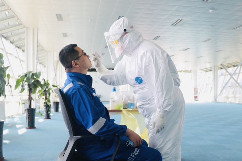 医务人员对航次科考队员进行咽、鼻试子联合检测