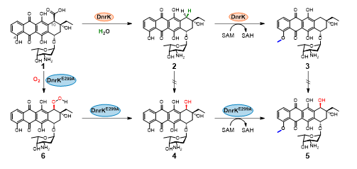 图1 DnrK及其突变体催化反应路径