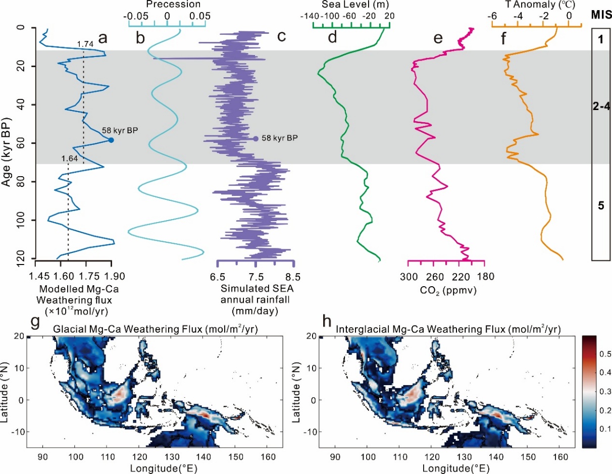 印-太交汇区是全球最重要的碳汇区域之一,这里宽广的陆架、较高的温度和充沛的降水,使其具有成为第四纪冰期-间冰期旋回中地表硅酸盐风化碳汇的潜在可能。但前人针对该区域的相关研究工作较少,仅基于少数钻孔记录零星地探讨了海平面变化对冰期时陆架风化作用的影响,进而难以从整体上准确评估印-太交汇区陆架风化在第四纪冰期-间冰期旋回中的碳汇效应。针对该关键科学问题,本研究首先基于地球化学模型GEOCLIM,并结合HadCM3古气候模型数据集,模拟了过去12万年内该区域地表硅酸盐风化通量的演变历史。其结果显示:冰期时的风化通量普遍高于间冰期,其平均增幅约为6%,而在极端低海平面时(如距今5.8万年左右)的增幅可达33%(图1a)。这一变化与冰期时巽他等陆架的广泛暴露密切相关,表明海平面的下降显著促进了该区域的地表硅酸盐风化过程。