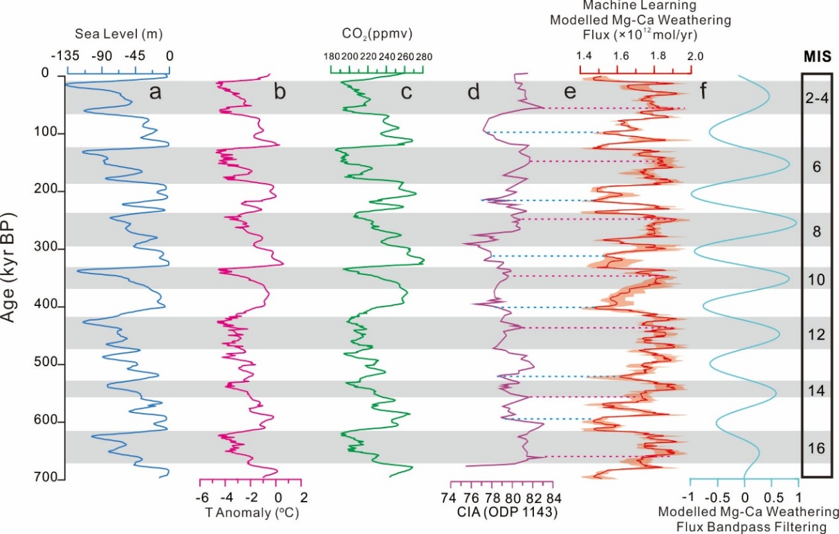 此外,为了查明多个冰期-间冰期旋回中研究区的风化演变历史,本研究引入了多种机器学习方法(如随机森林、集成学习及深度学习神经网络),对过去70万年内的风化通量进行了系统重建。其模拟结果表明:风化通量与海平面变化间具有显著的负相关性,并表现出明显的10万年周期(图2e)。这从数据驱动角度进一步印证了海平面波动对该区域硅酸盐风化过程的重要调控作用。