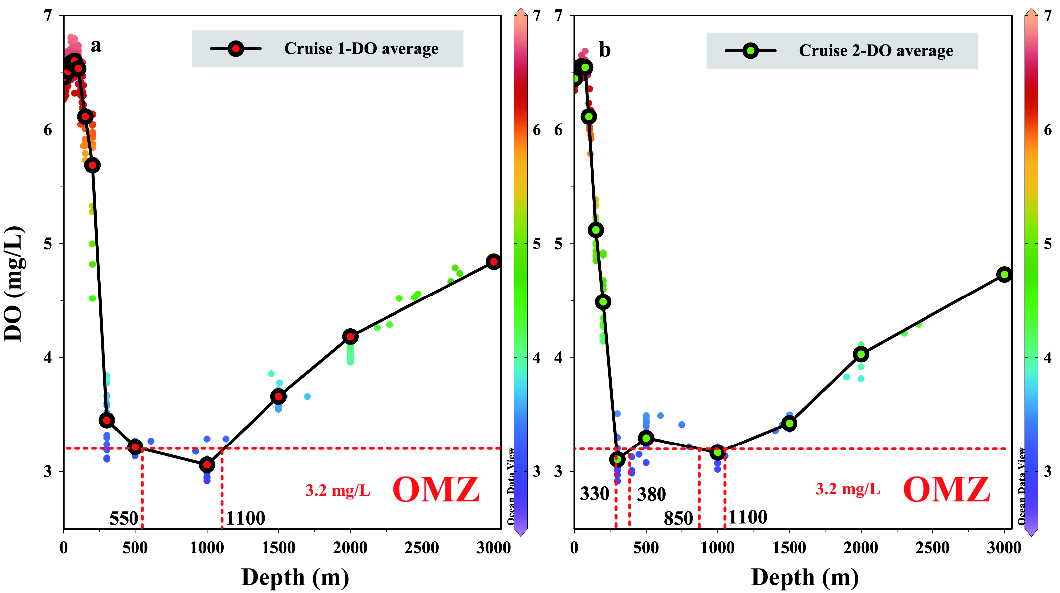 中国科学院海洋研究所针对西太平洋深海海山生态系统,先后组织实施了7个海山航次的综合调查。研究团队基于对西太平洋M4海山两个航次的调查,通过对DO、叶绿素a(Chl a)、颗粒有机碳(POC)、营养盐、pH及温盐等要素的高分辨率剖面分析,揭示了两个航次“海山效应”的差异,解析了该区域OMZ的结构(图1)。两个航次中,M4海山山顶附近出现明显的等温线和等盐度线抬升现象,伴随硝酸盐和磷酸盐的上涌;且航次1山顶附近的POC平均浓度是航次2的1.99倍,表明两个航次中均存在“海山效应”,且航次1的“海山效应”更强。以3.2 mg/L为阈值,航次1和航次2中OMZ范围和强度相似,范围分别为550~1100 m和330~1100 m,最低DO浓度分别为3.06 mg/L和3.11 mg/L,表明该区域的OMZ为典型的轻度OMZ(Mild OMZ)。