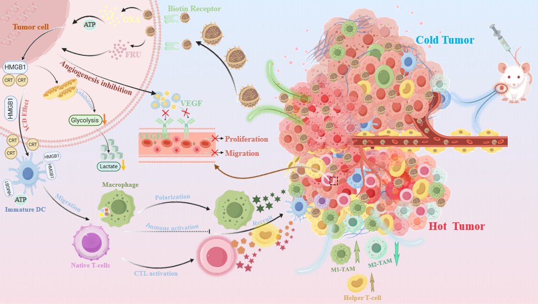 在结直肠癌治疗方面,团队构建了双靶向纳米载体(CS‑Arg/Fuc‑Bio@OF),用于同步递送奥沙利铂与呋喹替尼。该载体通过P‑选择素亲和与生物素受体双重主动靶向机制,实现了药物在荷瘤小鼠肿瘤部位的精准富集与酸性微环境响应释药。该系统协同实现免疫原性细胞死亡、肿瘤相关巨噬细胞M1极化、抗血管生成三重作用,从而高效抑制肿瘤增殖转移,且展现出优异的生物安全性(图2)。