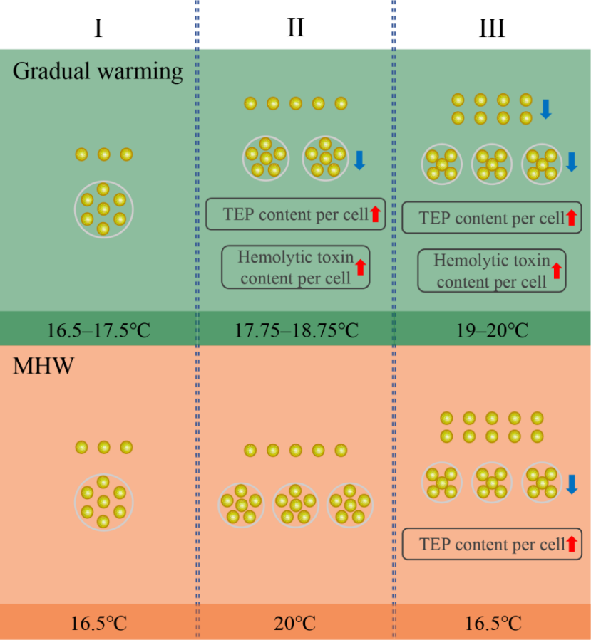 该研究模拟了三种温度情景:恒温(对照组)、渐进式增暖和海洋热浪,系统分析了P. globosa生长与代谢的动态过程。P. globosa在升温胁迫下采取“生长抑制、代谢增强”的策略。生长上,两种升温模式均显著抑制P. globosa整体细胞生长,但囊体细胞比单细胞更敏感。代谢上,两种升温模式对不同代谢产物的增强作用存在差异,渐进式增暖可显著提升P. globosa细胞内透明胞外聚合物颗粒(TEPs)与溶血毒素含量;海洋热浪仅增加 TEPs 含量,两者均对二甲基硫醚(DMS)含量无显著影响。此外,更值得关注的是对两种升温模式响应的时间动态,即对渐进式增暖的响应迅速,而对海洋热浪的响应则表现出显著的滞后,通常在海洋热浪结束后才显现。