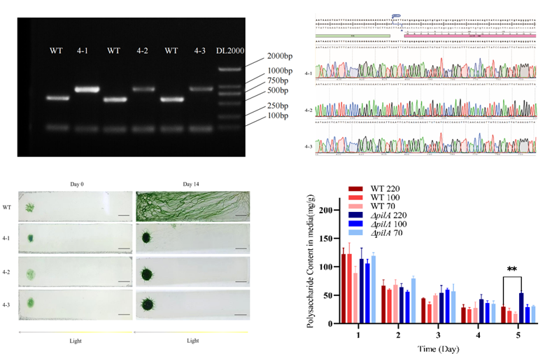海洋所研究揭示螺旋藻pilA基因调控多糖合成和细胞聚集的关键作用