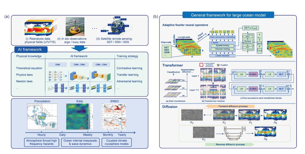 (a)通过整合多源数据,结合不同类型AI方法,实现跨时空尺度的海洋现象预测;(b)概括了海洋大模型预报的通用框架。