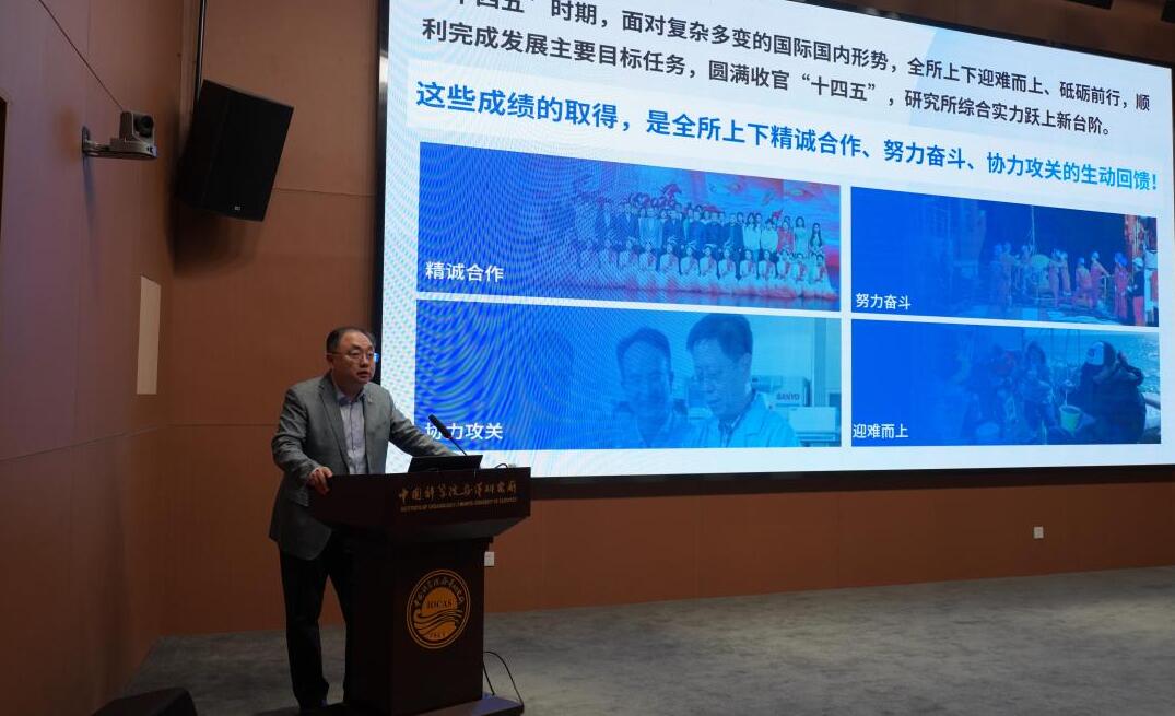 所长王凡作题为“勇担国家战略使命 砺剑深蓝崭新征程 奋力书写‘十五五’抢占科技制高点宏伟蓝图”的主题报告,全面总结了研究所“十四五”期间的重要进展,部署了“十五五”工作规划及2026年重点任务。王凡指出,“十四五”时期,全所上下凝心聚力,研究所综合实力、基础设施和条件保障水平全面提升,书写了一份科技报国的优秀答卷。五年来,研究所围绕国家战略需求,奋力攻坚,认真谋划抢占海洋领域科技制高点;深入实施“十四五”规划,取得了一系列重要创新成果,科技竞争力实现新跃升;坚持国内外协同创新,不断扩大国际“朋友圈”,持续提升世界海洋领域影响力;坚持“以人为本”,不断加强人才引进培养,集聚了一批创新人才;坚持守正创新,针对制约发展的若干问题,实施一系列改革举措;统筹各类经济资源,持续优化资源配置,研究所经济运行平稳;持续夯实科技基础能力,建设了一批高能级创新平台,以一流平台汇聚创新要素。这些成绩的取得是全体职工和研究生勠力同心、砥砺奋斗的结果,王凡代表研究所领导班子向大家表示衷心感谢。